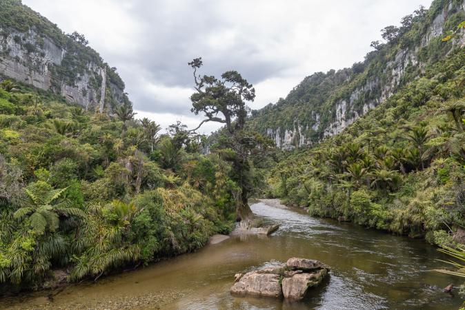 On va ensuite randonner dans Paparoa National Park et on emprunte le Pororari River Track jusqu'au pont de singe. Le trail est dans une jolie forêt qui longe une rivière couleur or.