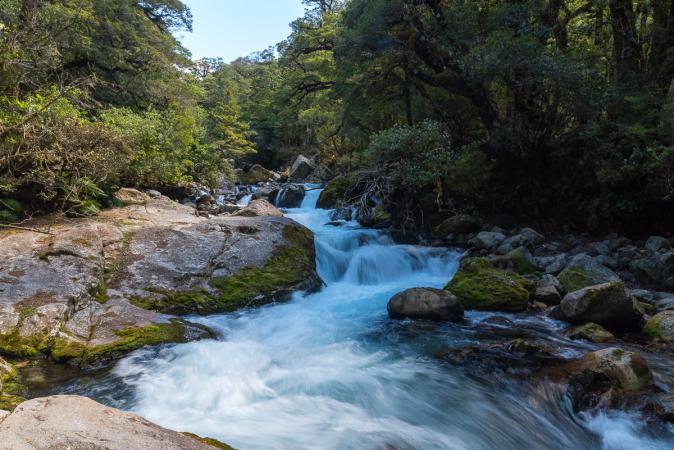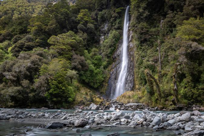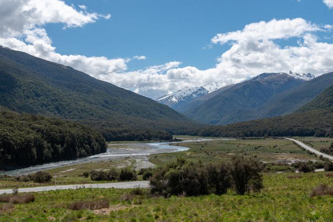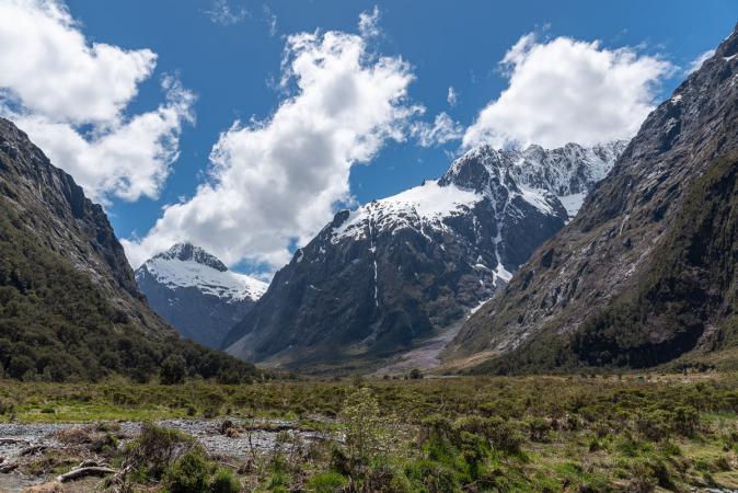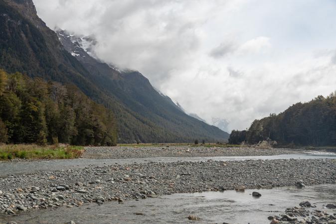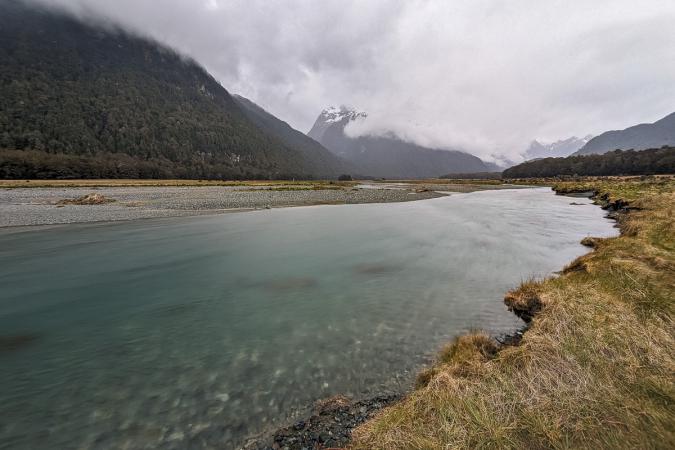 On admire, on grignote, on prend notre temps. Retour au van vers 13h00. On continue sur la route 94 en direction de Milford Sound. Arrêt à Monkey Creek, vue sur les montagnes enneigées.