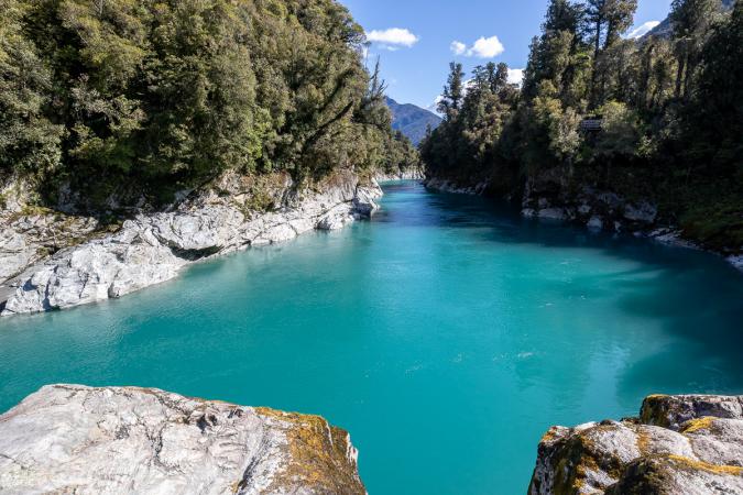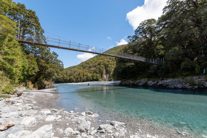 On reprend la route direction les gorges d'Hokitika à une demi-heure. Le sentier passe dans la forêt puis il faut traverser un pont suspendu. La rivière est bleu turquoise, c'est incroyable, cette couleur. Le chemin continue jusqu'à une petite plage. C’est très beau.