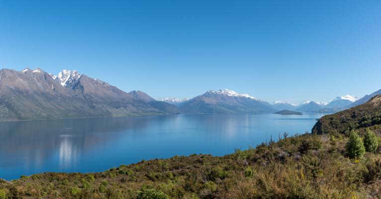 Vendredi 10 novembre : debout à 7h30. Il fait 7° dans le van, ça traîne pour se lever ! Par contre, grand ciel bleu. On quitte Queenstown à 9h15. Ce n'était pas prévu mais comme on a un peu de temps, on va à Glenorchy. Sur la route, arrêt à Bennetts Bluff Viewpoint qui nous offre un beau panorama sur le lac Wakatipu.