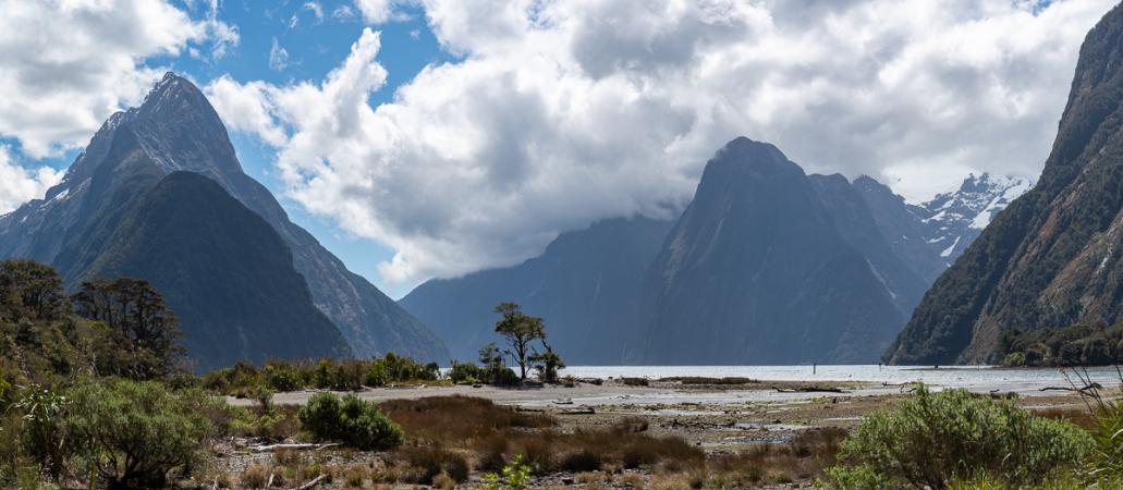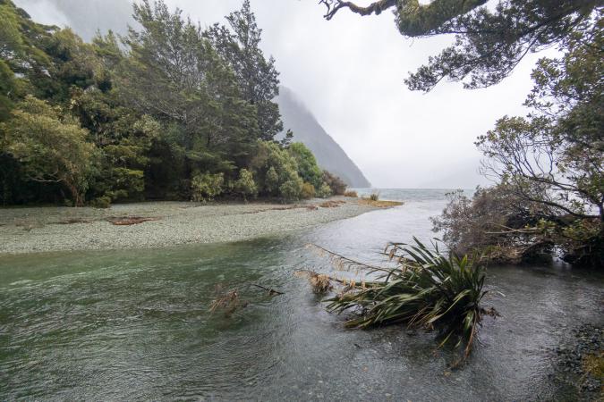 On arrive à Milford Sound à 14h15. On se gare à l'entrée de la ville. En fait, il n'y a rien d'autre que les départs en croisière ! On combine Foreshore Walk qui nous permet de voir le fjord, dommage qu'il soit à contre jour,