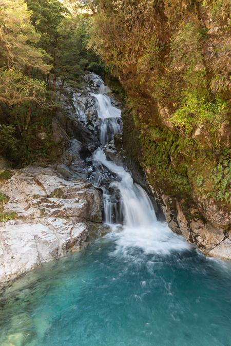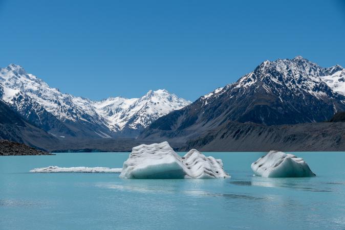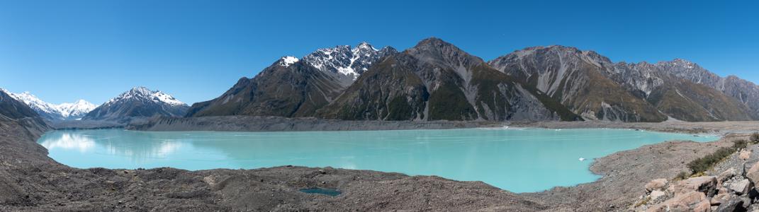 Nommés Blue Lakes en 1800, ils étaient alimentés directement par le glacier qui s'approchait beaucoup plus près. Maintenant que le glacier a reculé, les lacs ne sont plus alimentés que par la pluie. Ce qui entraîne une apparition d'algues vertes. Le trail conduit ensuite à un point de vue sur le lac Tasman et son glacier. Encore un bleu, waouh !