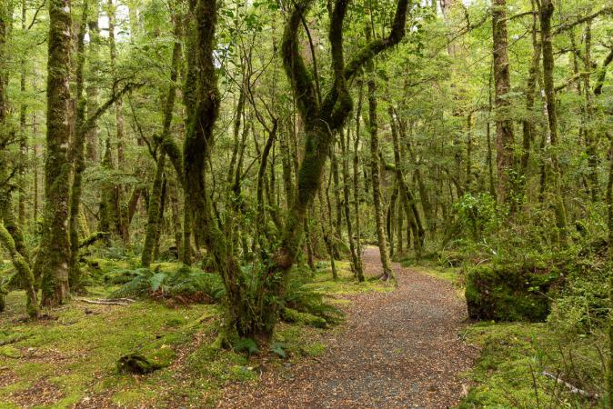 Dimanche 12 novembre : debout à 8h15. Il pleut. Petit déjeuner dans le van. Départ pour Manapouri à 9h50. On continue nos arrêts sur la Highway 94. Au bout du camping, il y a un sentier pour aller voir le lac Gunn. Le chemin passe en forêt.
