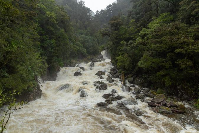 et Lookout Track qui n'est pas terrible. On mange un morceau au café de Milford. On rejoint le van à 16h00 et on reprend la Highway 94 en sens inverse, Milford Sound étant un cul de sac. Arrêt à Tutoko Lookout, vue sur la rivière et les montagnes en arrière-plan depuis le pont.