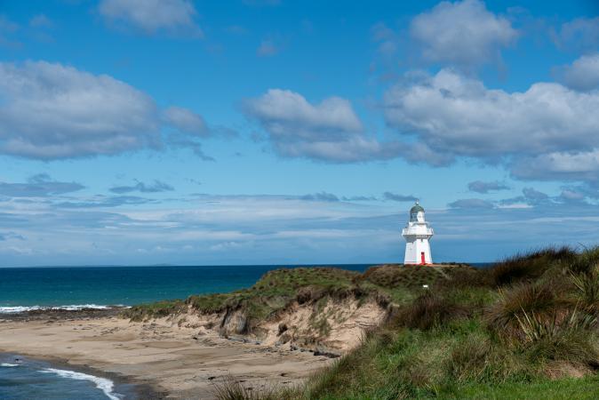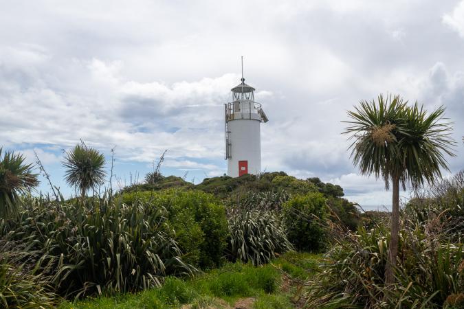 Mardi 14 novembre : debout à 7h30. Le beau temps est revenu malgré quelques nuages. Petit déjeuner dans le van. Vidange. Départ à 9h05. On continue notre route vers la côte Sud de l'île du Sud, les Catlins. On sort d’Invercargill et on ne voit que des prairies"plates" pour les moutons et les vaches. Puis de nouveau, quelques petites collines agrémentent le paysage. On emprunte la Southern Scenic Road qui traverse les Catlins d’Ouest en Est. On s'approche de l'Océan Austral. Notre premier arrêt sur la côte est à Waipapa Point Lighthouse. Il s’agit d’un petit phare blanc avec une porte rouge en haut de la falaise.