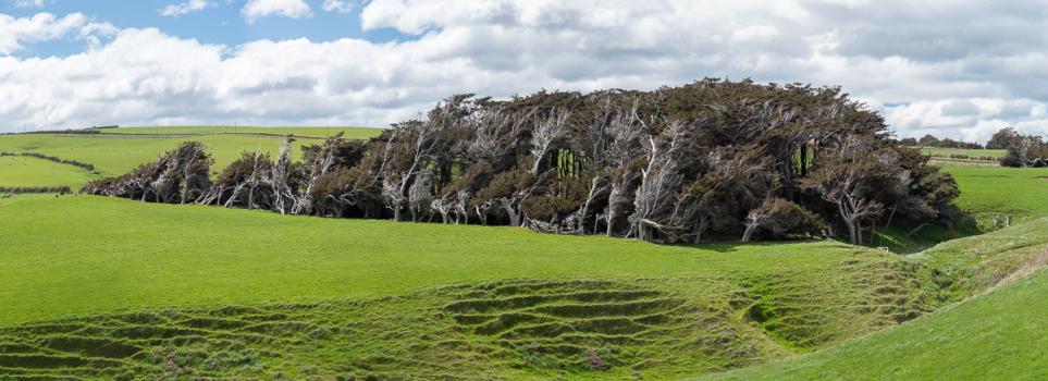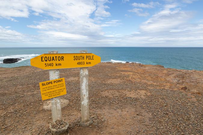 La route qui mène à Slope Point, notre prochaine étape, est très jolie et fait les montagnes russes. Slope Point est le point le plus au Sud de l'île du Sud. C'est un endroit très venteux, en témoigne les arbres tordus par la force des vents.