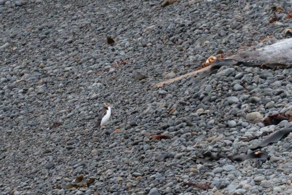 On voit 2 otaries mais pas de pingouin. C'est la période où ils nichent et il commence à y avoir des petits. La plage est justement interdite en ce moment. Pour avoir une chance de les voir, il faut venir avant 7h00 ou à partir de 16h00. On fait un petit pique-nique au bord de la plage. Puis on file chercher un camping. On s'installe au Kaka Point Campsite Ground vers 14h45. A 17h00, on retourne à Roaring Bay voir s'il y a des pingouins. Vers 19h30, un pingouin apparaît sur la plage mais il est très loin, puis un second. Même avec les téléobjectifs, ils sont tous petits. Dommage.
