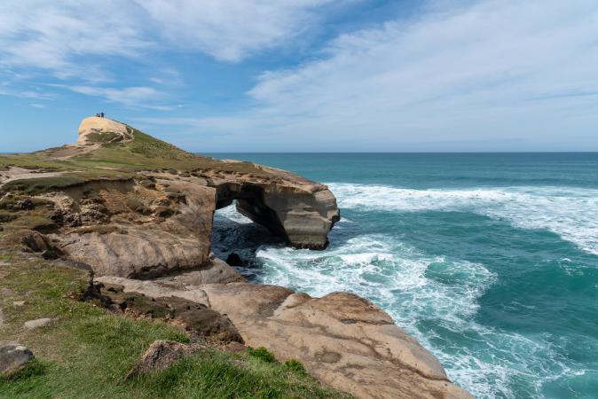 Jeudi 16 novembre : debout à 8h00. Grand ciel bleu donc petit déjeuner dehors. Départ à 9h45, on prend la direction de Dunedin. On se rend à Tunnel Beach au Sud de Dunedin afin de voir un pont dans la falaise et l'océan à ses pieds. L'accès à pied est très raide, 140 m de dénivelé pour 900 m de long. A la descente, ça va, mais la remontée va être plus dure !