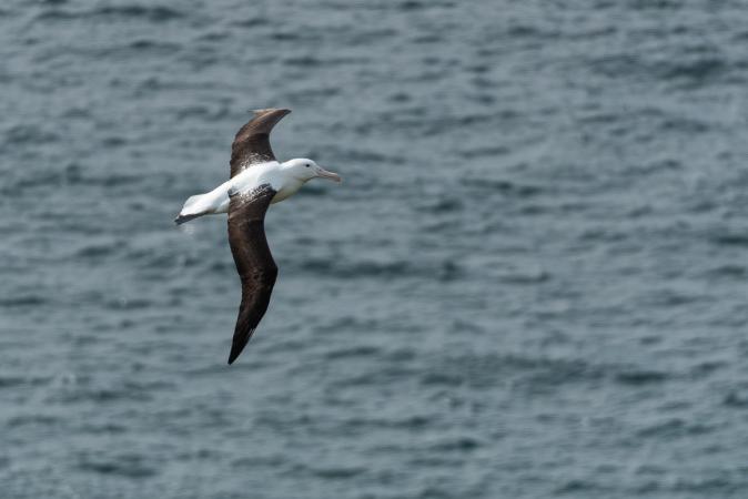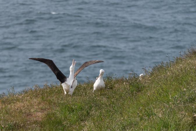Il y a également un tunnel creusé dans la roche avec des marches pour se rendre sur la plage. Puis on va dans la Péninsule d’Otago. En passant, on prend un emplacement au camping de Portobello Village Tourist Park. On grignote et on file au bout de la péninsule. A cet endroit, on peut voir des pingouins et des albatros. Je pensais bêtement qu'on pouvait voir les albatros librement ! Mais non c'est payant. En fait, un jour, un homme a élevé une femelle albatros et son œuf. Et depuis, ils sont protégés donc tous bagués. Un centre pour leur protection a été créé, le Royal Albatros Centre. Je trouve un peu inadmissible de payer pour voir des oiseaux en liberté. Tout est bon pour faire du fric ! Bon, on est assez con pour payer car on a envie de les voir. On prend une visite guidée (61€ pour nous deux) pour 17h00 sinon pas moyen d'en voir depuis le parking, la vue sur la mer et leur lieu de vie étant bouchée par une colline. Et c'est quand même bien fait car les albatros ne viennent pas voler au dessus du parking ! Ils doivent être télécommandés ! En plus, la visite ne dure qu'une demi-heure après une intro et un film de 10 minutes. L’observation se fait derrière une vitre. On en voit quelques uns en vol et sur la colline. Heureusement !