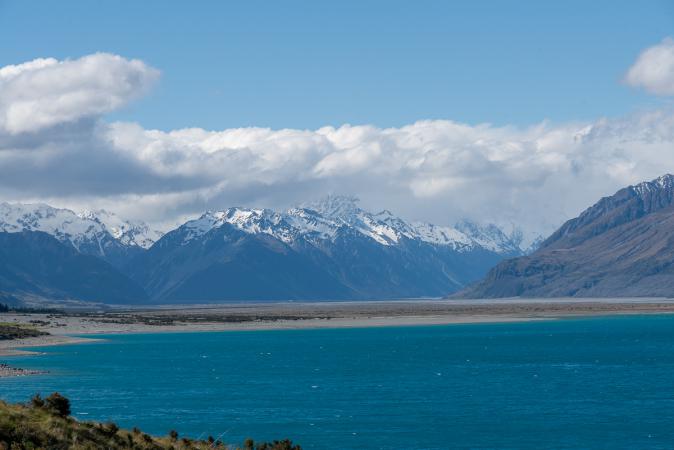 On continue notre route en direction de Pukaki. On se présente au camping Twizel Holiday Park un peu avant Pukaki Village mais c'est complet. On regarde sur le site de Campermate et on voit une dispo au camping de Glentanner, le long du lac Pukaki en direction du Mont Cook. On réserve et on y va. En longeant le lac, on fait quelques arrêts photos.