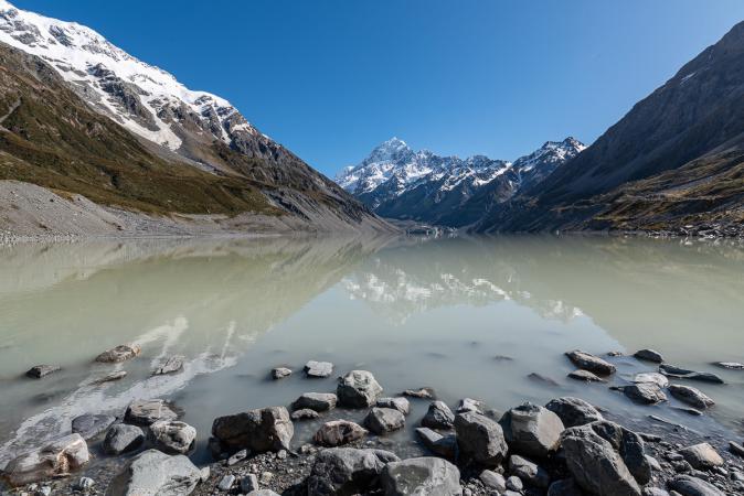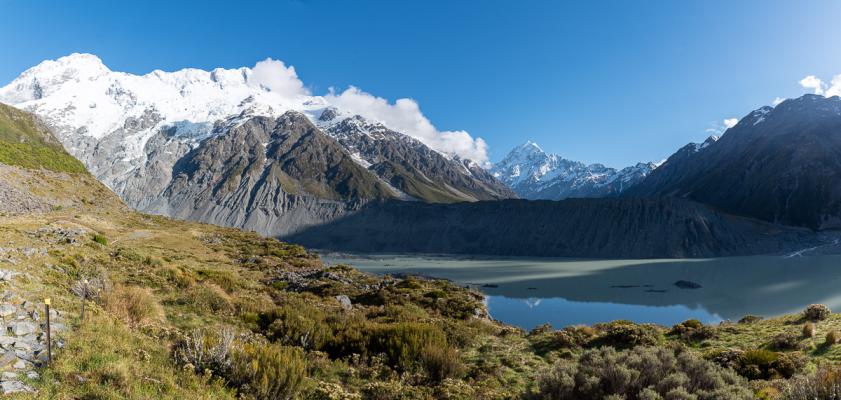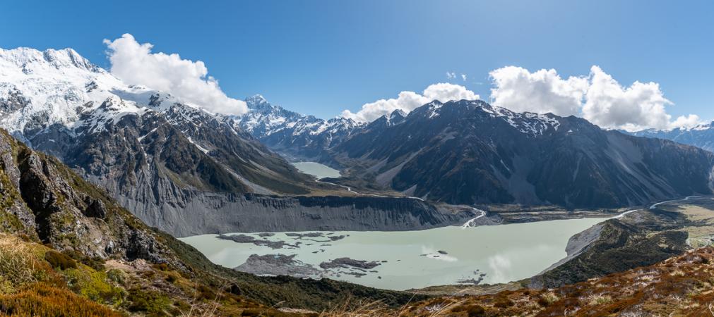 Au bout du trail, la vue est grandiose sur le Mont Cook, les lacs Mueller et Hooker. Waouh !