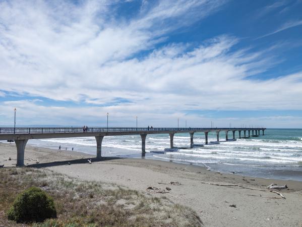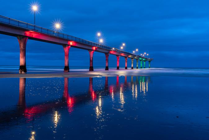 On pique-nique sur la plage. Vers 15h00, on se dirige vers le camping South Brighton Holiday Park à New Brighton dans la banlieue de Christchurch. Sur la route, des flics arrêtent les voitures : test d'alcoolémie. David s'y plie en répétant one two three four five ! Négatif, évidemment ! Le camping n'est pas du même niveau qu'hier, c'est vieillot. Petit tour derrière le camping en bord de lac. Dîner dehors. A la nuit tombée, on retourne au ponton pour faire des photos avec l'éclairage qui change de couleur régulièrement.