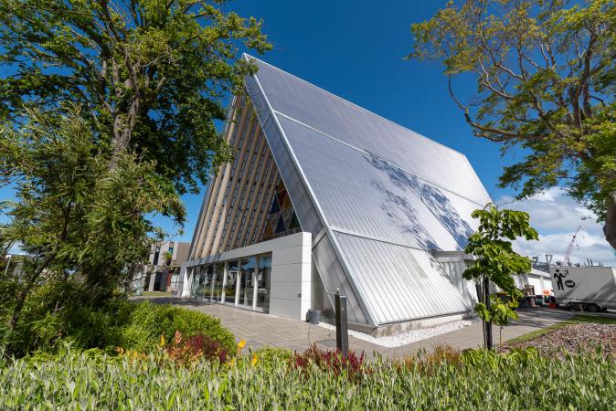Puis on pique-nique en finissant les restes sous les yeux attentifs de canards qui ne ratent pas une miette qui tombe ! Vers 13h30, on file chez Travellers Autobarn de Christchurch pour rendre le van. Ça va assez vite, le gars ne vérifie rien. Il y a 202 008 km au compteur, on a donc fait 5 975 km en 5 semaines. Au revoir « pépère » ! On appelle un Uber et à 14h30 on est à l'hôtel Christchurch City Center. La chambre est classe. On fait le check-in pour les vols et les visas de transit de Singapour. On part ensuite faire un tour dans Christchurch vers 15h45. Tout en faisant quelques achats souvenirs, on visite la ville. La Transitional Cathedral ou Cardboard Cathedral (cathédrale en carton) est de forme triangulaire comme à Tromso en Norvège.