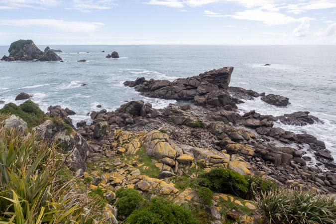 Dimanche 5 novembre : debout à 5h45. Beau temps. Départ à 7h10. On prend la route pour descendre vers la côte Ouest de l'île. Arrêt courses à Motueka, ainsi qu'un café et un genre de pain au raisin, pas mauvais du tout. C'est jour de marché, on en a vite fait le tour. On reprend la longue route. Lorsque les néo-zélandais ont des surplus de production de fruits ou légumes, ils les mettent en vente devant chez eux. On s'arrête à une petite cahute où il y a des pommes et on met l’argent dans une boîte prévue à cet effet. Pause vers 12h00 sur une aire. On goutte les pommes, elles sont bonnes et bien sucrées. Et il pleut à nouveau. On s'approche de la côte et la pluie cesse. On arrive à Cape Foulwind à 14h45. On va juste voir le phare. Mais on ne le voit pas bien, l'accès est limité.