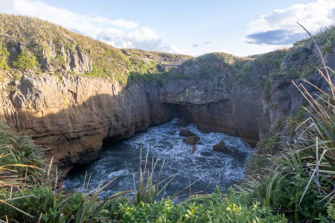 On repart pour Punakaiki. On voit bien les gros nuages bloqués sur les montagnes pendant qu'on se dirige vers la côte. On arrive au camping Punakaiki Beach Camp à 17h15. Petit tour sur la plage pendant que tourne la lessive. On met ensuite le linge dans le sèche linge et comme il y en a pour une heure, on va aux Pancakes Rocks. Entre 18h00 et 19h00, ce n'est pas l'heure idéale mais les fracas de la mer dans les gouffres en dessous sont impressionnants.