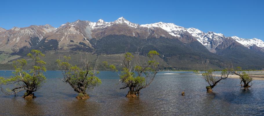 On atteint Glenorchy à 10h30. Le point d'intérêt de ce village est un alignement d'arbres dans l'eau, un peu comme Wanaka. Pas évident à prendre en photo car ils sont près de la rive.