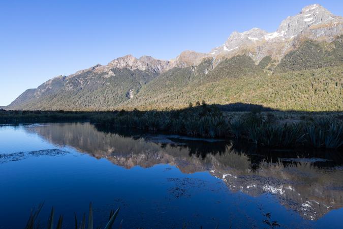 Samedi 11 novembre : debout à 6h00. Brrr 6° ce matin dans le van ! Et encore un grand ciel bleu. Petit déjeuner dans la cuisine commune. Départ à 7h15. On remonte la route Highway 94 en direction de Milford Sound avec plusieurs arrêts. Le premier arrêt est à Mirror Lake. Comme son nom l'indique, il reflète joliment la montagne.