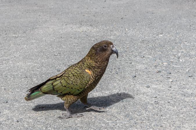 Puis on s'arrête à The Chasm : la rivière se jette dans un gouffre étroit et profond. On ne voit pas grand chose. Après ce gouffre, le chemin est fermé suite à des dégâts d'une tempête en 2020, il ne rouvrira qu'en 2024. Direction Christie Falls. Avant on s'arrête à un point de vue avant le tunnel. Heu… pourquoi les gens me regardent descendre du van ? Ah non c'est pas moi, il y a un kea sur le toit du van juste au-dessus de ma tête ! C'est le premier qu'on voit. C’est la seule espèce de perroquet des montagnes au monde, il est endémique de NZ. C'est un oiseau qui aime bien grignoter les joints des vitres de voiture, les essuies glaces...