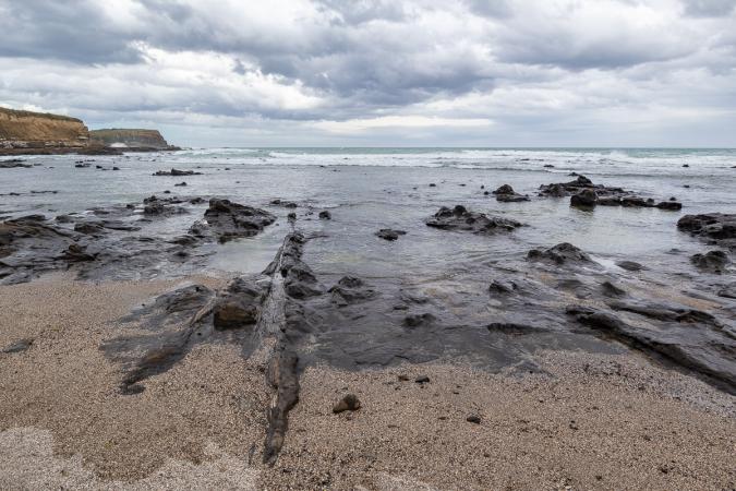 On va ensuite pique-niquer sur la falaise de Curio Bay. Le temps de redescendre sur la plage et la Petrified Forest, le temps se dégrade. On fait quelques photos des arbres pétrifiés pris dans la roche et il se met à pleuvoir.