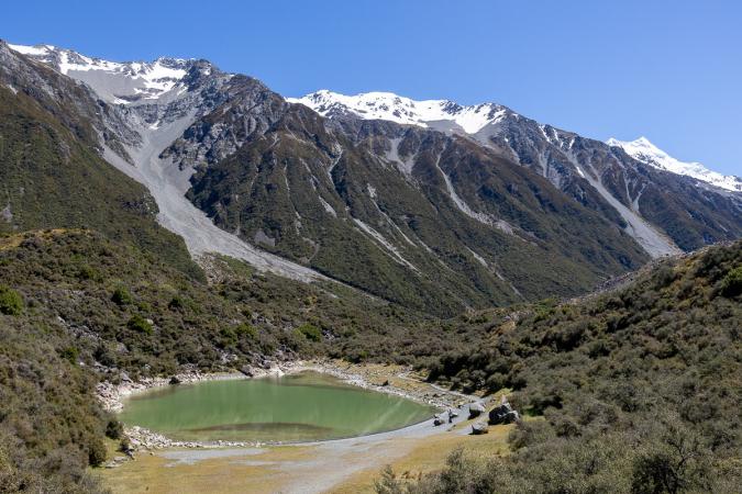 Ayant commencé tôt, il n'y a pas encore trop de monde. Par contre, lors du retour, on en croise beaucoup. On a fait 10,7 km avec un dénivelé positif de 138 m. On reprend le van pour 8 km pour changer de parking. On fait une autre randonnée qui combine les Blue Lakes et Tasman Glacier. On va d'abord voir les lacs d'en bas. Ils sont plutôt verts, en fait.