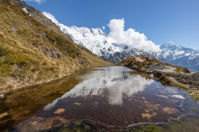 On entend la montagne gronder et un morceau de neige/glace tombe. Faut revenir un peu sur nos pas pour emprunter le chemin vers Sealy Tarn. Ça commence tranquillement avant d'attaquer 600 m de dénivelé sur 2 km de long et ce, sur des marches en bois presque à la verticale. C'est très casse pattes, ça fait mal aux cuisses. Plus on monte et plus la vue est belle. Arrivé à Sealy Tarn, la montagne se reflète dans le petit bassin d'eau.