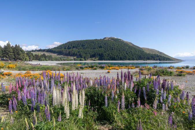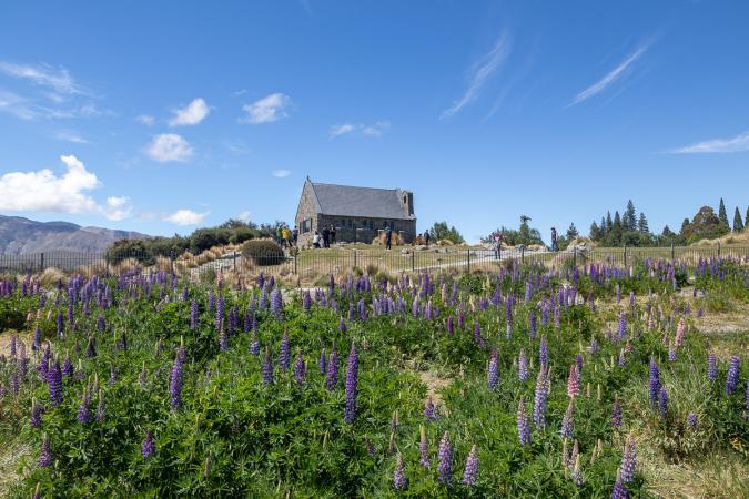 Lundi 20 novembre : debout à 8h00. Petit déjeuner dehors. C'est couvert mais il fait bon. Vidange du van. Départ à 10h00 en direction du lac Tekapo avec deux arrêts sur le lac Pukaki. Vers 10h30, on se gare en bord du lac Tekapo et on va voir la célèbre petite église Church of the Good Shepherd (l'église du bon berger). On espérait la voir avec plein de lupins devant depuis l'autre côté de la rive mais il n'y en a pas. En fait, c’est une plante invasive pour les néo-zélandais, donc ils essayent de l’éradiquer. On traverse le pont piétonnier pour s'approcher. Il y a pas mal de monde. Et quelques lupins quand même.