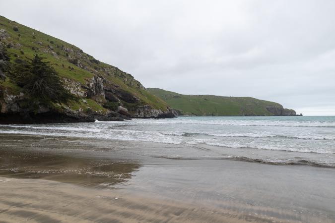 On tente d'aller dans une baie de l'autre côté d’Akaroa, à Le Bons Bay. Ça grimpe dans la montagne et on se retrouve dans les nuages. Ça s'éclaircit dans la descente. Le petit village Le Bons Bay est bien isolé avec sa petite plage coincée entre des falaises. Faut aimer la solitude !