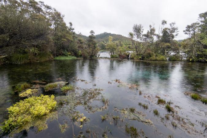 Au bout de la plage, il y a une petite caverne. Des pirogues arrivent près du rocher et les passagers chantent un genre de petit haka. On reprend la route à 11h00. Vu la météo, on ne va pas faire la randonnée prévue dans Abel Tasman National Park. On file directement vers Farewell Spit et Golden Bay. Sur la route, on fait un arrêt à Te Waikoropupu Springs voir les sources sacrées de Pupu Spring et Dancing Sands Spring (boucle de 1 km).