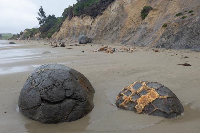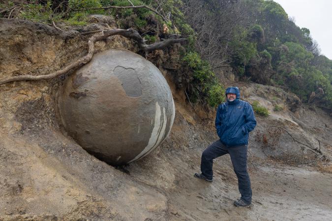 Vendredi 17 novembre : debout à 6h45. Il pleut des cordes. Petit déjeuner dans le van. Départ à 9h35. On devait visiter Dunedin ce matin puis aller à Moeraki pour voir le phare et les Boulders, gros rochers en forme de boule dont certains sont cassés net en deux, visibles sur une plage à marée basse. Après un check de la météo, on change le programme. Il doit faire beau samedi et mardi du côté des lacs Pukaki/Tekapo/Mont Cook. Comme ce sont de très beaux coins avec des belles randos, on va privilégier ces endroits. Tant pis pour Dunedin. La route nous fait passer par Moeraki. On fait un arrêt vite fait sous la pluie. Les Boulders sont hors de l'eau.