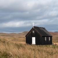 Small black wooden church from the 19th century isolated in the middle of nowhere. It burned down in 2010 and was rebuilt in 2020.