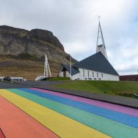 Small church of the city of Olafsvik with a modern architecture. The road leading to it is painted with the colors of the rainbow.