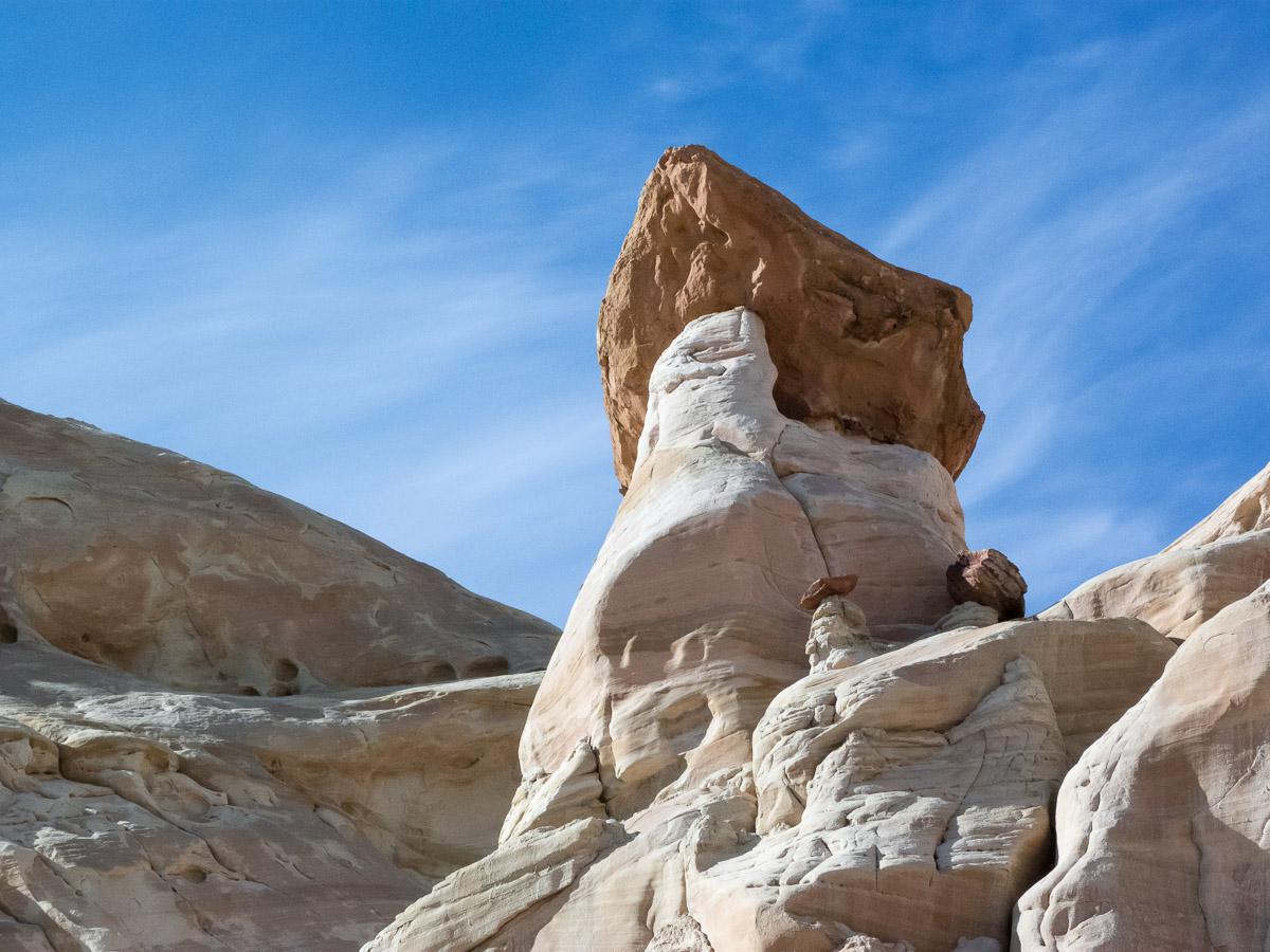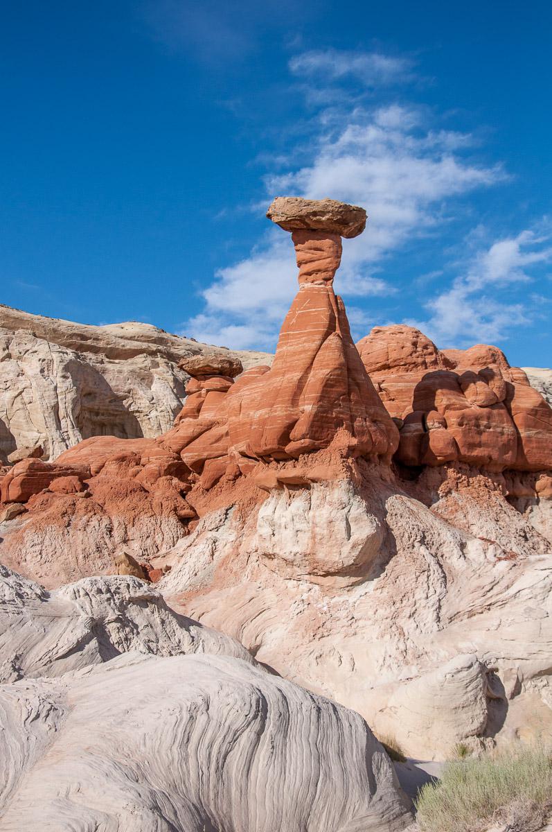 Nous arrivons au Wahweap Campground de Page vers 14h. C’est 24$ l’emplacement et 2$ la douche. Nous montons les tentes sur un emplacement en plein soleil ! En milieu d'après midi, nous partons vers Toadstool Hoodoos. Depuis Page, il faut prendre la US89 en direction de Kanab, le parking, visible depuis la route, se trouve après la jonction avec la Cottonwood Road. Facile d’accès à pied, entre 10-15 minutes depuis le parking. Le site n’est pas très grand, il n’y a pas beaucoup de hoodoos.