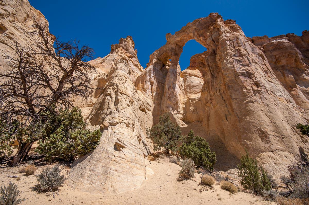Jeudi 7 juin : nous continuons notre périple en empruntant la Cottonwood Road. La route se fait bien en 4x4. Nous faisons un arrêt à Grosvenor Arch. Petite marche pour y accéder et l’arche est très jolie.