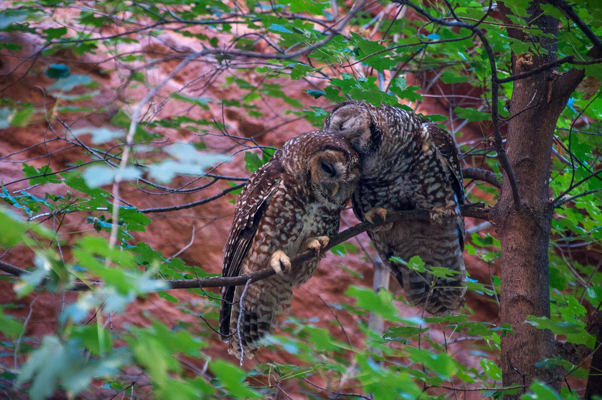 Sur le chemin, nous passons devant un couple de hibou avec son petit, qui reste un peu à l'écart dans un grotte.