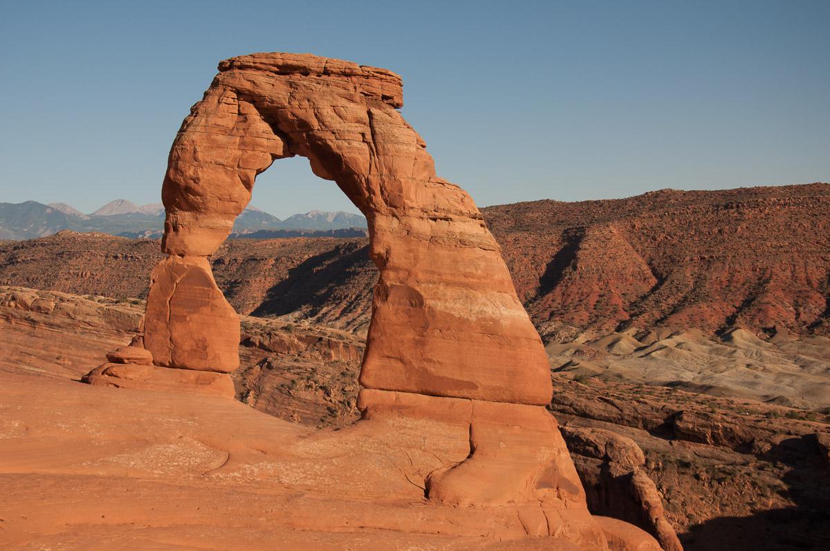 La chaleur commence a être insupportable (35°) surtout qu'il n’y a pas d’ombre. A 15h30, nous rentrons à l’hôtel et sur la route, nous atteignons les 100°F (37,8°) ! Nous allons manger une glace dans Moab puis allons nous reposer un peu au frais dans la chambre. En fin d'après midi, nous partons à Delicate Arch pour assister au coucher de soleil, il fait toujours aussi chaud (~40°). Nous commencons la randonnée à 18h30, il nous faut 35 minutes pour monter. Il y a déjà plein de monde et il faut être patient pour prendre des photos à cause des touristes qui posent devant. L'arche qui s'illumine au fur et à mesure que le soleil descend est toujours aussi belle.