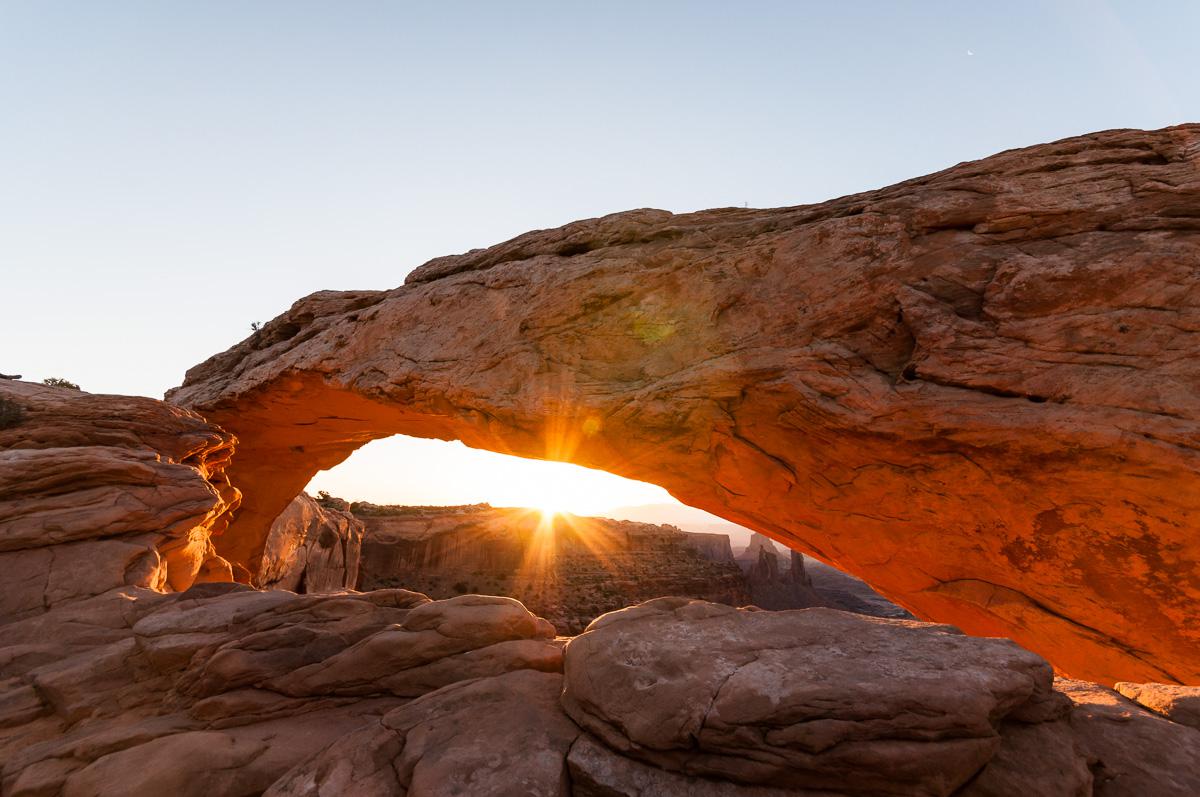 Jeudi 14 juin : nous nous levons à 3h50 pour aller assiter au lever de soleil sur Mesa Arch dans Canyonlands. C’est une petite arche assez jolie par laquelle se lève le soleil. Le dessous de l’arche devient alors orange et c'est magnifique. Par contre, l'endroit est très fréquanté par les photographes.