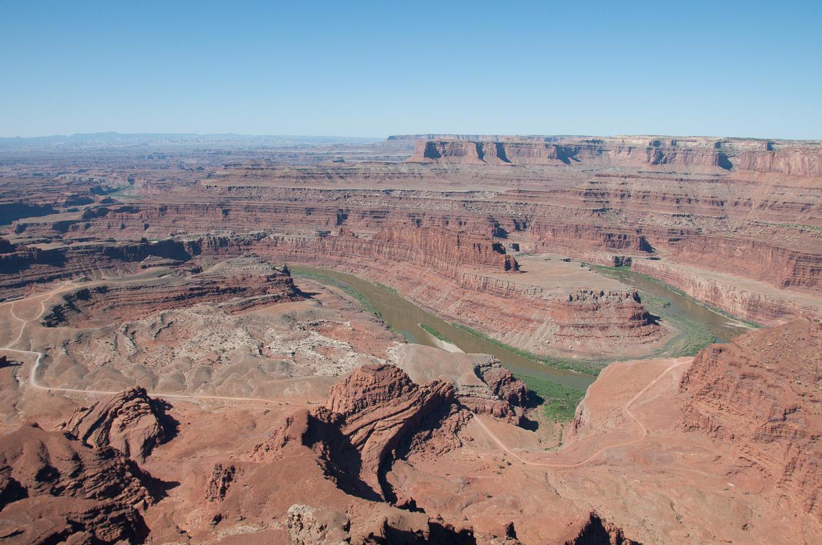 Buck Canyon Overlook, pas mal mais est à contre jour le matin. Il fait déjà 24° à 8h30 ! Puis, nous allons à Dead Horse Point (10$ l’entrée). Nous faisons quelques photos.