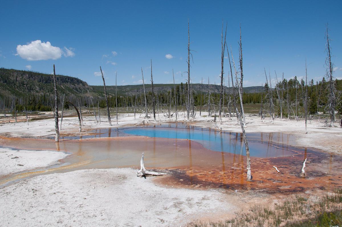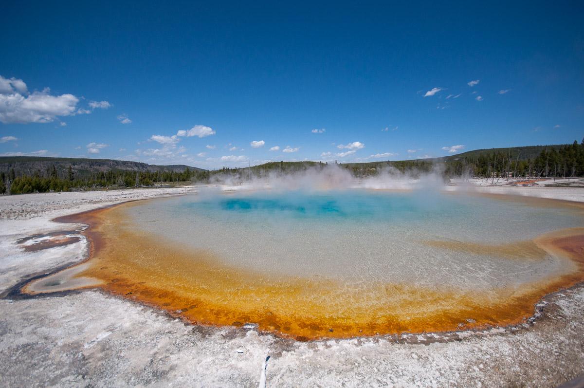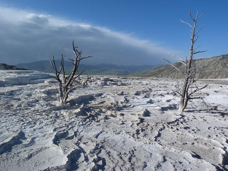 Midway Geyser Basin avec le Grand Prismatic cette fois vu du plancher des bisons, Firehole Lake avec le Great Foutain Geyser et enfin Mammoth Hot Spring dans sa partie de Canary Spring. Ici, les couleurs ont beaucoup changé par rapport à ce qu’on a déjà connu ici ; cette fois tout est blanc et sans contraste de couleurs.