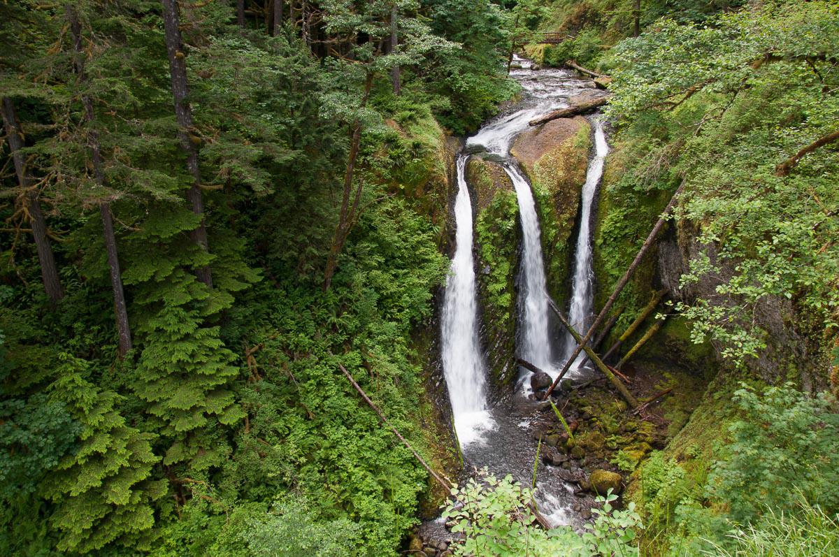 Mercredi 27 juin : nous allons aujourd'hui poser nos premiers pas dans l’état de Washington pour aller à la cascade Panther Creek Falls. Nous traversons la Columbia River sur le Bridge of the God (1$). Nous passons Carson, faisons 6-7 miles, tournons à droite puis à gauche sur Panther Creek Road, n°65. Le parking en gravillons se situe à droite. Le trail est à 50m à l’ouest. Il faut y être avant 9h30, on arrive trop tard car une partie de la cascade est déjà au soleil.