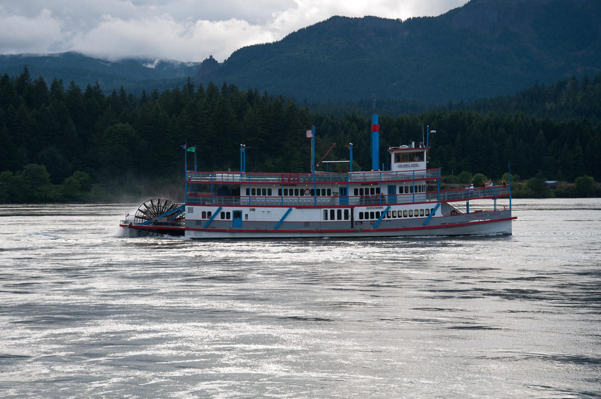 Mardi 26 juin : et il pleut encore ce matin. Vers 11h00, nous partons traîner en voiture du côté de la ville de Hood River. Nous montons jusqu’à Panorama Point. Il y a une jolie vue sur la vallée, le Mont Hood et tous les gros nuages ! Nous essayons d’aller à Lost Lake mais une fois arrivés au lac, et à cause du brouillard, nous voyons à peine le lac. Nous retournons sur The Dalles pour manger au Denny’s. Nous allons faire un tour à Marine Park dans Cascade Lock. On y voit plein de pêcheurs à l’épuisette et un bateau comme dans Tom Sawyer !