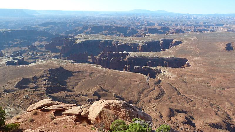 Ensuite, nous partons faire le tour de quelques viewpoints de Canyonlands : Green River Overlook, c’est un beau point de vue le matin ; Overlook (bof !) ; Grand View Point, belle vue sur le canyon en patte d’oie ;