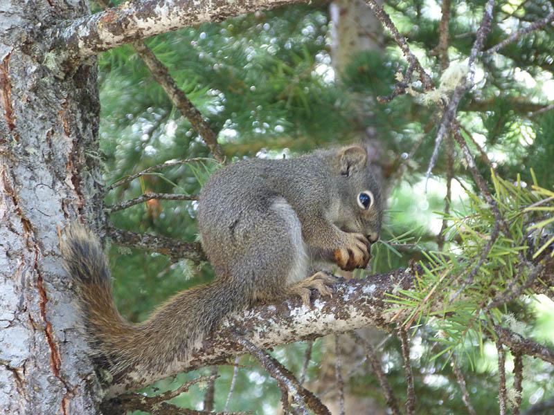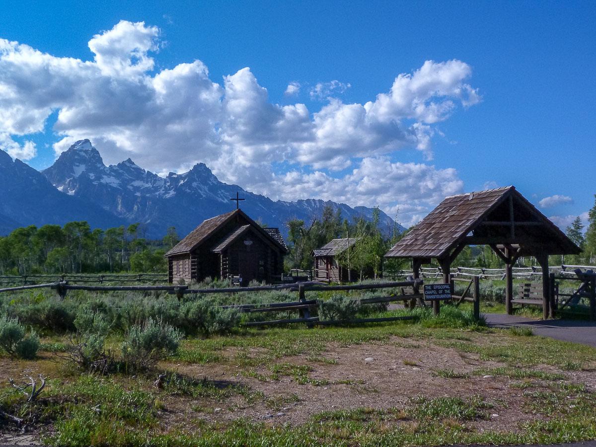 Des écureuils nous tournent autour et sont prêts à rentrer dans nos sacs afin de récupérer les miettes de nos en-cas. Ayant encore du temps devant nous après cette rando, nous allons à Colter Bay faire la balade Lakeshore Trail (3 kms), mais c’est très moyen. Sur la route en rentrant, il y a un attroupement de voitures et de gens ainsi qu’un ranger. A 400 m dans les herbes hautes, nous voyons un ours... enfin surtout ses oreilles et parfois sa tête. Apparemment, il s’agit d’une femelle avec ses petits. Nous continuons notre route en passant par la Chapel of Transfiguration,