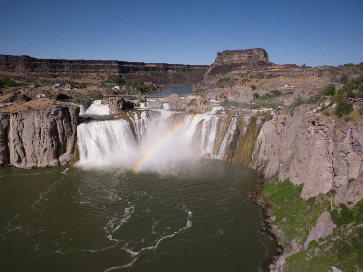 Il y a un trail de 2 miles AR qui va à Lower Mesa mais la vue n’est pas terrible. Sur la route, nous nous arrêtons à un view point sur Lower Mesa. Ensuite, nous nous dirigeons vers Twin Falls. Nous faisons un arrêt à Shoshone Falls. Le viewpoint Overlook se situe juste avant l’entrée, qui est de 3$ et qui permet d’accéder au site et au Canyon Rim Trail. Nous empruntons une partie de ce trail jusqu’à la passerelle qui donne une vue différente de Shoshone Falls et plus complète sans rochers devant.