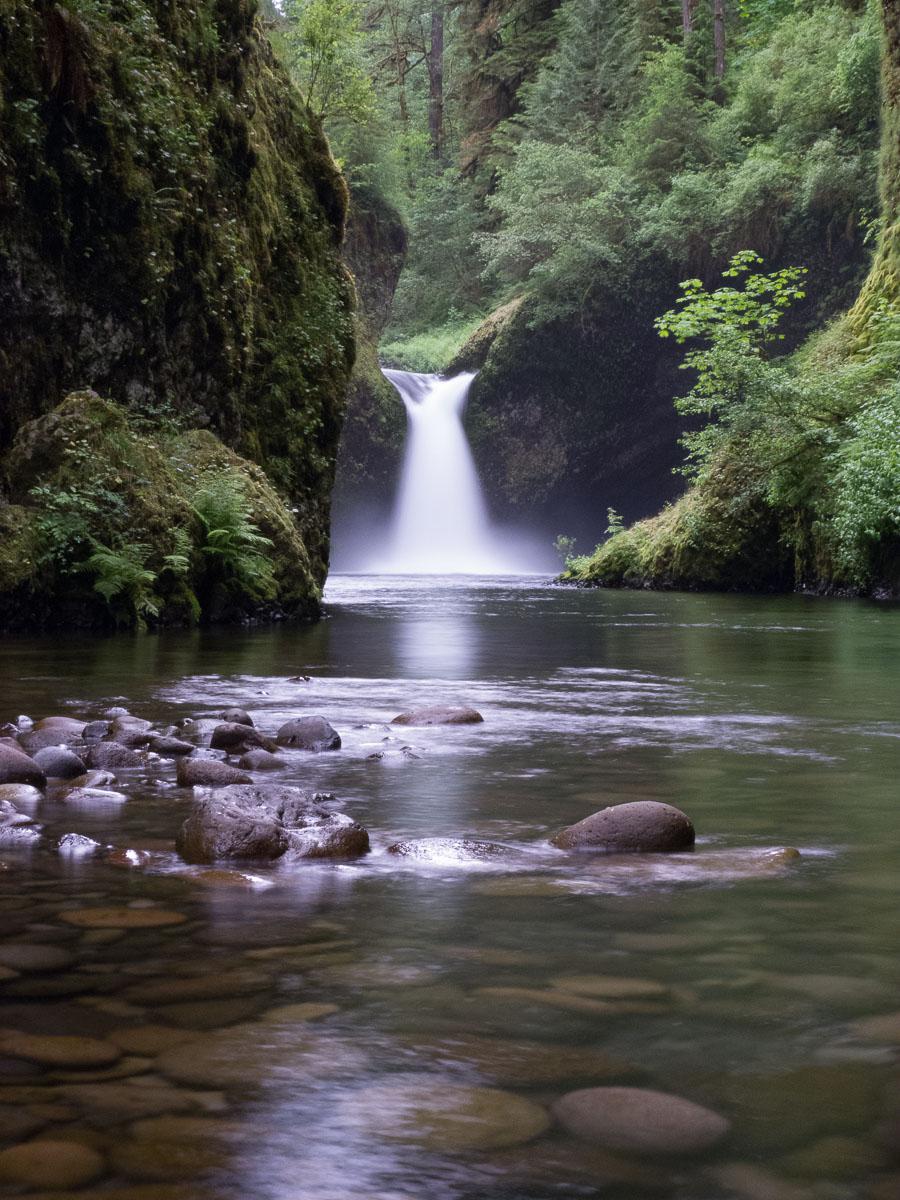Dimanche 24 juin : finalement, nous décidons de prendre les nuits suivantes en cabin car la météo ne prévoit pas beaucoup d’amélioration dans les jours à venir. On sera plus au sec et les tentes ne seront pas mouillées pour remettre dans les sacs pour le départ ! Dans la matinée, nous partons pour Eagle Creek Trail (sortie 41 de la I84). L’entrée est de 5$ mais gratuite avec l’annual pass. Nous allons jusqu’à Punchbowl Falls. Ca grimpe ! La cascade est encaissée dans la gorge et donc facile à louper. Il faut s’avancer au milieu de la rivière sur des gros cailloux. Attention, c'est glissant.