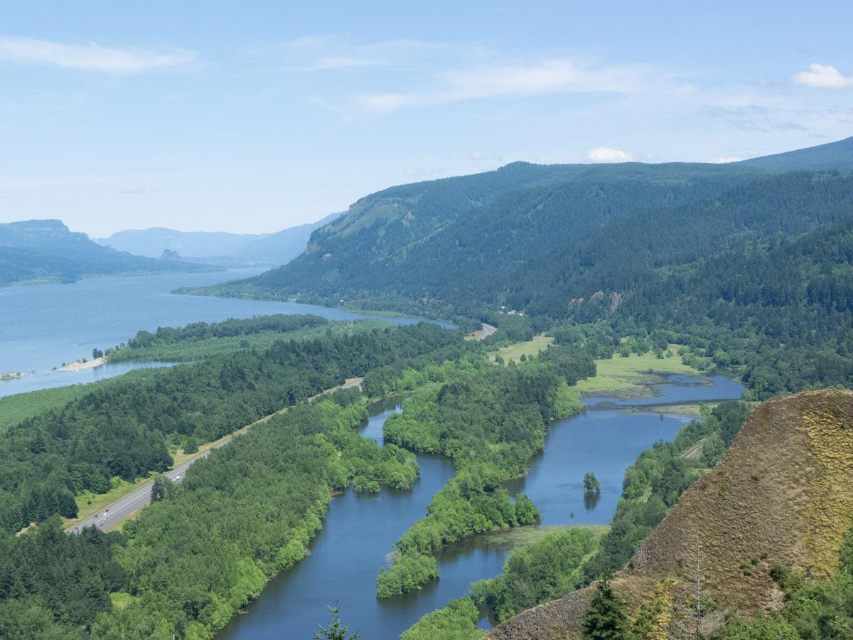 Nous nous dirigeons ensuite vers Latourell Falls mais la route est bloquée justement aujourd’hui à partir du Vista House Crown Point. D'ici nous profitons de la vue imprenable sur la Columbia River et toute la vallée.