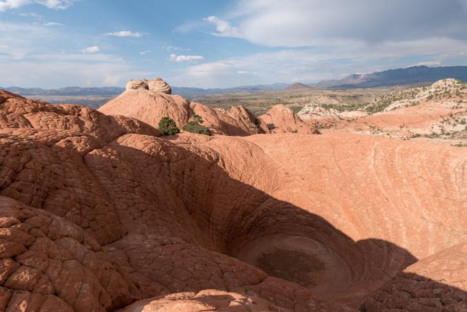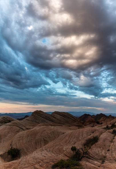 Tuesday, September 5 : we will try to change our car at Alamo at St George's airport. Unfortunately, they do not have a 4WD in stock. We join Etienne and Stéphane at McDo at 1 pm. Then, we start preparing the backpacks bags in the Smith's car park. We leave at 4:20 pm to go to Yant Flat where it is almost 102 ° F. At 5:30 pm, we start the hike to Yant Flat. The beginning is a little in the forest and the end is painful in the brush and the sand. Once arrived, we put the backpack to explore the area at sunset. It's superb, the shape of the hills is reminiscent of large scales. The colors are superb.