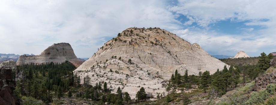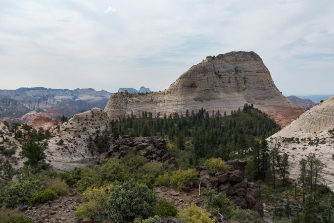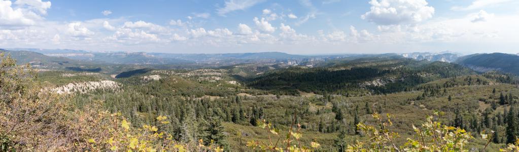 Thursday september 7 : departure for Zion National Park, Kolob Terrace part. However, we must first go to Springdale to buy the $ 80 America the Beautiful pass. We go back to take the Kolob Terrace Road. We arrive at Wildcat Trailhead that we take for 0.9 miles. The trail is nice under the pines under a cool overcast sky, then we follow the Northgate Peaks Trail for 1.1 miles (at the 2nd sign). It drops a few drops of rain. At the end of the trail, the Northgate Peaks stand on either side of us: Northgate Peak East and West.