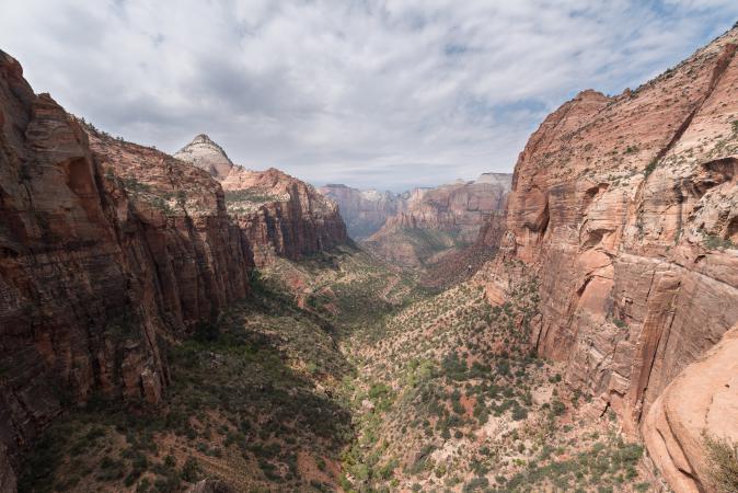 Friday september 8 : an elk quietly crosses the groves behind our location, it makes no noise and it is not afraid of us being very close. Magic ! Everything is still calm. It is not too cold, 57 ° F. We take off at 6:30 am. It starts to rain. We stop at Springdale to refuel and a few shopping. Then we cross Zion. The rain has stopped, there is even a little clearing. Oh, miracle ... there are parking spaces available at the end of the tunnel. It's rare. We take the opportunity to park and finally be able to go to Canyon Overlook which is 1 mile round trip. The view is very nice but blocked by the gray sky.