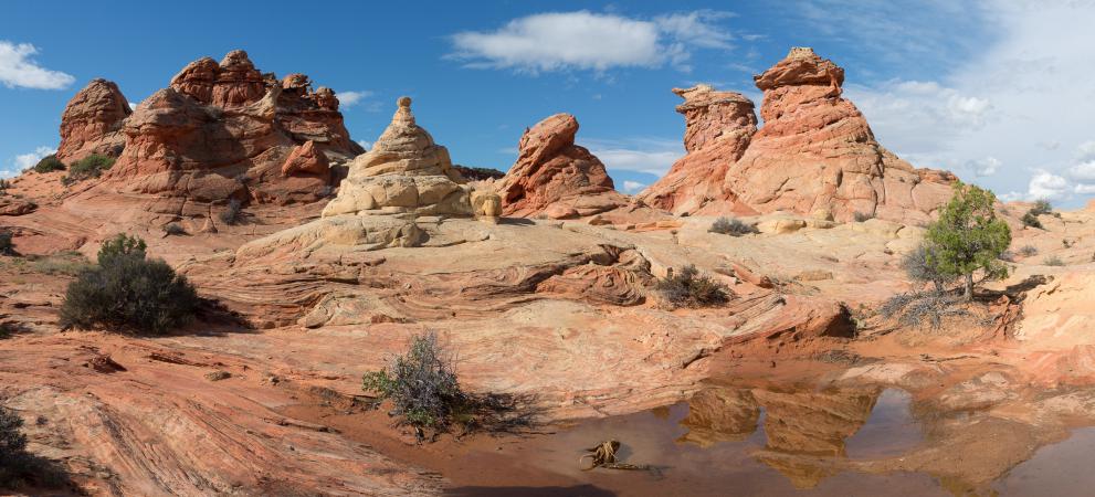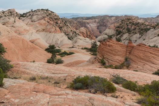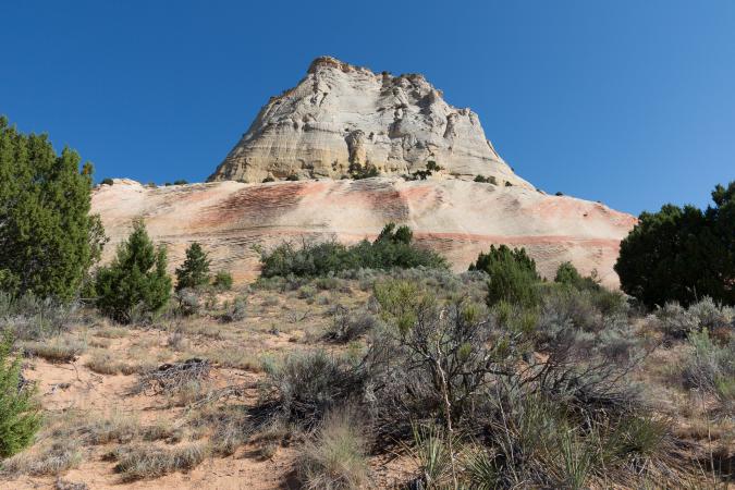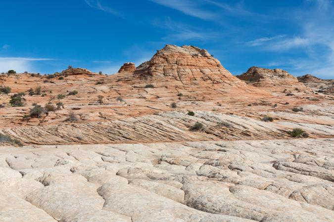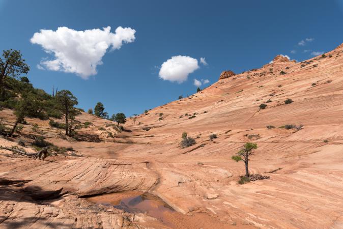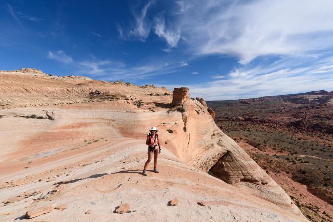 Monday, September 11th : backpacks are being prepared for the backpacking at White Dome. We leave Kanab at 7:40 am. There are flags everywhere in the streets. The road to Colorado City is doing well. Then we take the Water Canyon Road to Squirrel Canyon parking lot. 1600 feet before, there is a delicate passage but cars pass. We start the hike at 8:55 am and it is 70° F. It begins with a descent then a rise in soft sand. We cross a dry wash. The path continues in the undergrowth and rises gradually. We cross a very small stream, we take the opportunity to hide bottles of water for the return. They will be very fresh. At one point, there is a rather steep climb in a scree of pebbles. It's not very long luckily. Finally, we walk on slickrock and it always goes up. The landscape is very beautiful.