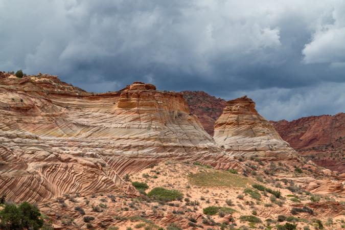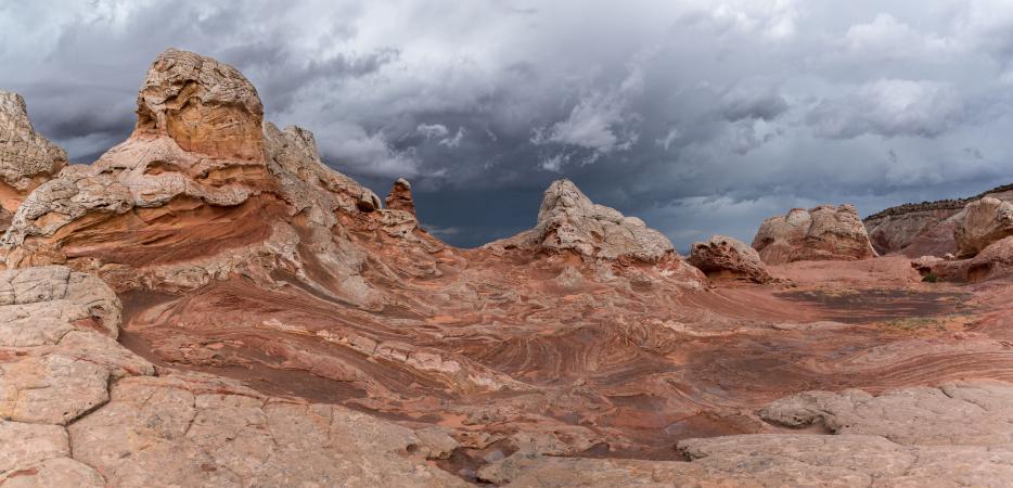 It finally burst storms all around us and finally we have rain. We put our rain ponchos. The guide suggests we continue the visit of Cottonwood Cove because he is not sure to be able to take us to White Pocket because the track is under construction and it rains. We return to the car around 12:30 pm. Eric phones Steve to know the condition of the tracks. Finally, he leads us to White Pocket. Cool ! I would have been disappointed not to go. The track is even more sandy than the other. The whole visit of the site is done in the rain. Too bad because there is a lot of potential for photos. That said, this black sky gives a dramatic side to the photos.